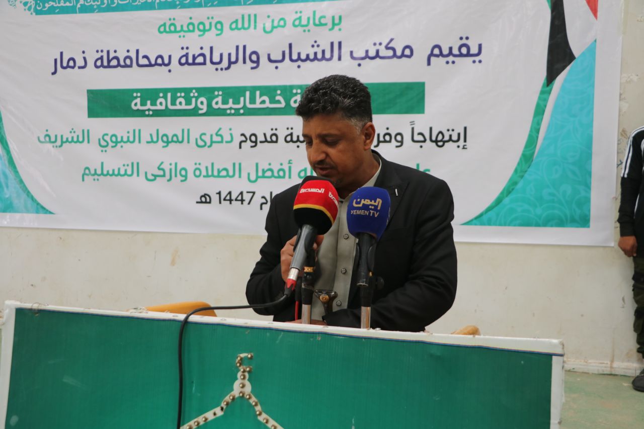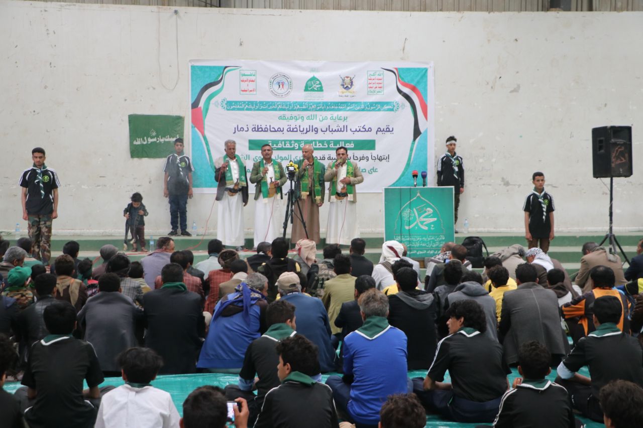 نظم مكتب الشباب والرياضة بمحافظة ذمار اليوم، فعالية ثقافية وإنشادية احتفاء بقدوم ذكرى المولد النبوي الشريف بحضور وكيلا المحافظة أحمد الضوراني ومحمود الجبين وعضو مجلس الشورى حسن عبد الرزاق ورئيس هيئة مستشفى ذمار العام الدكتور حمود الموشكي.