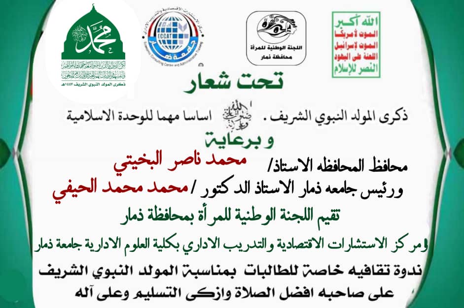 نظم فرع اللجنة الوطنية للمرآه بمحافظة ذمار ومركز الاستشارات الاقتصادية والتدريب الإداري بكلية العلوم الإدارية بجامعة ذمار اليوم ندوة ثقافية بمناسبة ذكرى المولد النبوي الشريف.