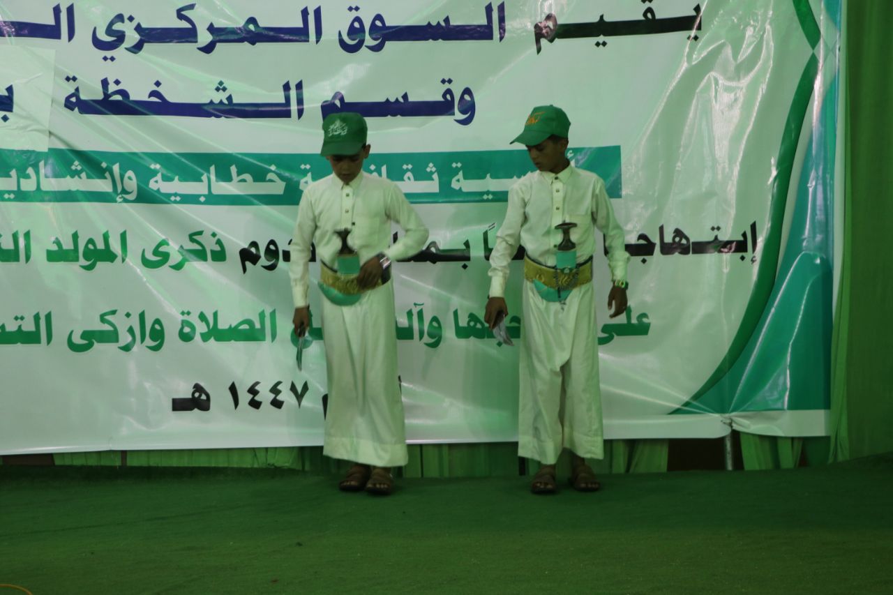 نظم السوق المركزي القديم وقسم الشهيد الشخظة، بمدينة ذمار مساء اليوم، أمسية خطابية وانشادية بمناسبة ذكرى المولد النبوي الشريف.