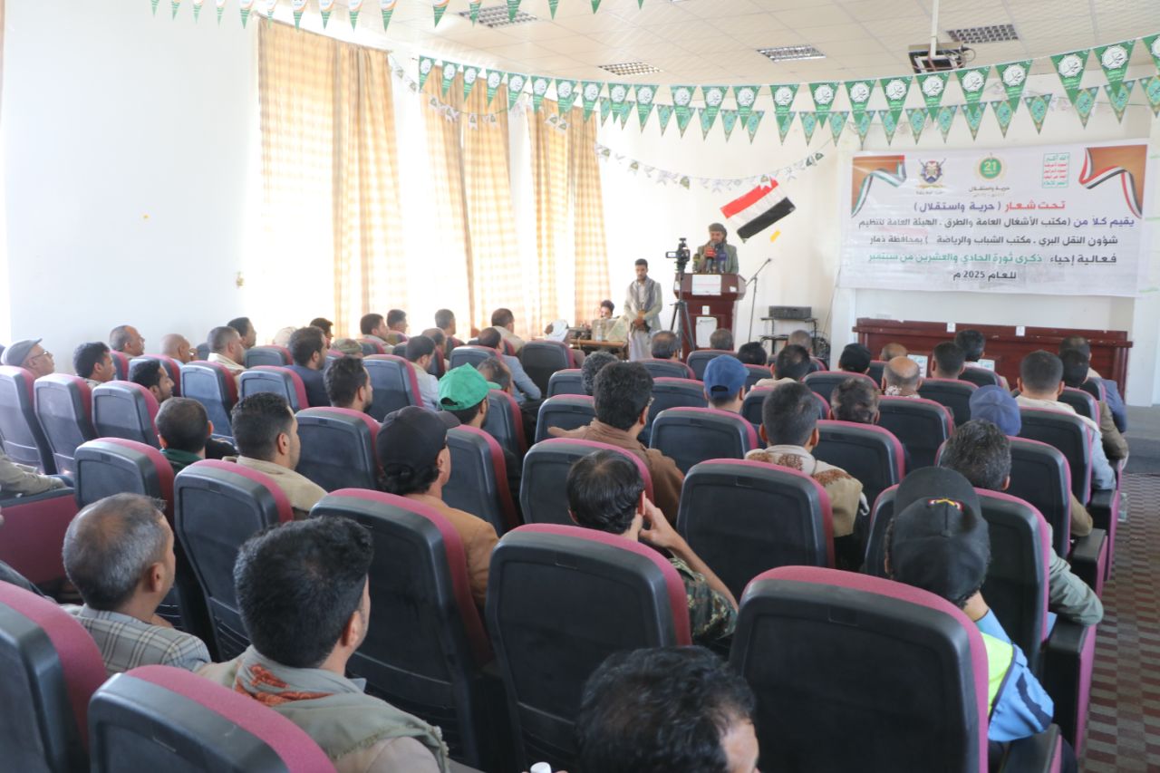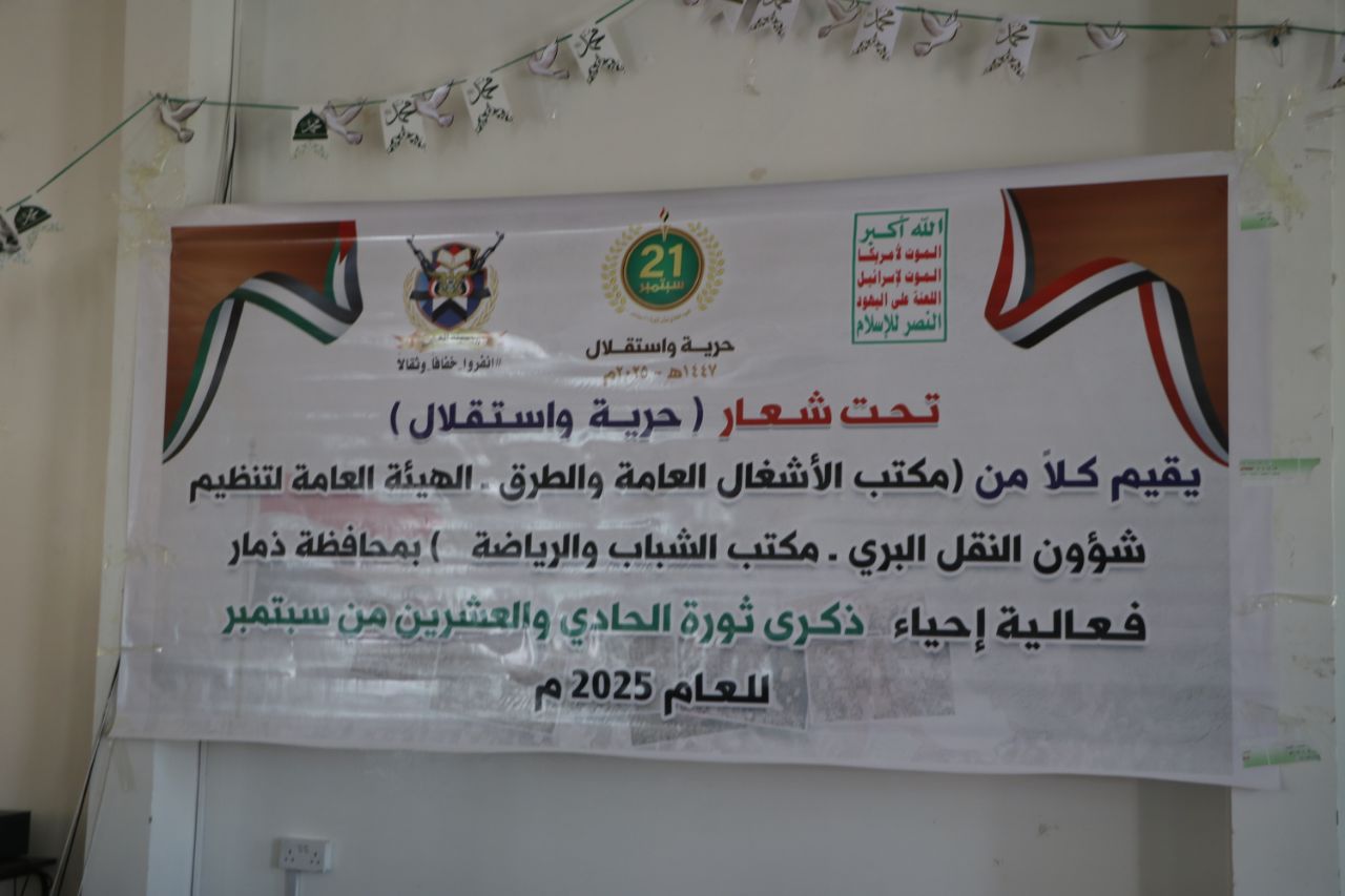 نظمت مكاتب الأشغال العامة والطرق والشباب والرياضة وفرع الهيئة العامة لشؤون النقل البري بمحافظة ذمار اليوم، فعالية خطابية احتفاءً بثورة 21 سبتمبر.