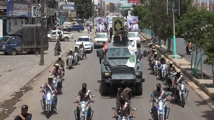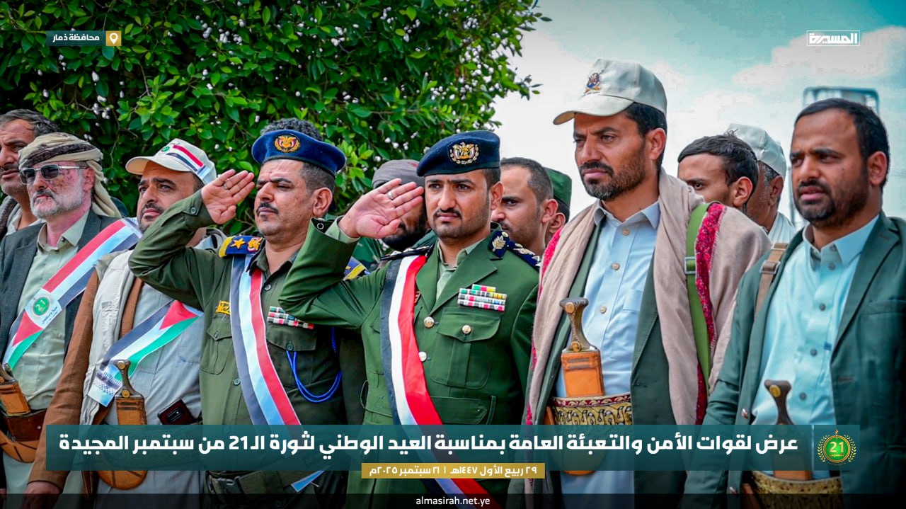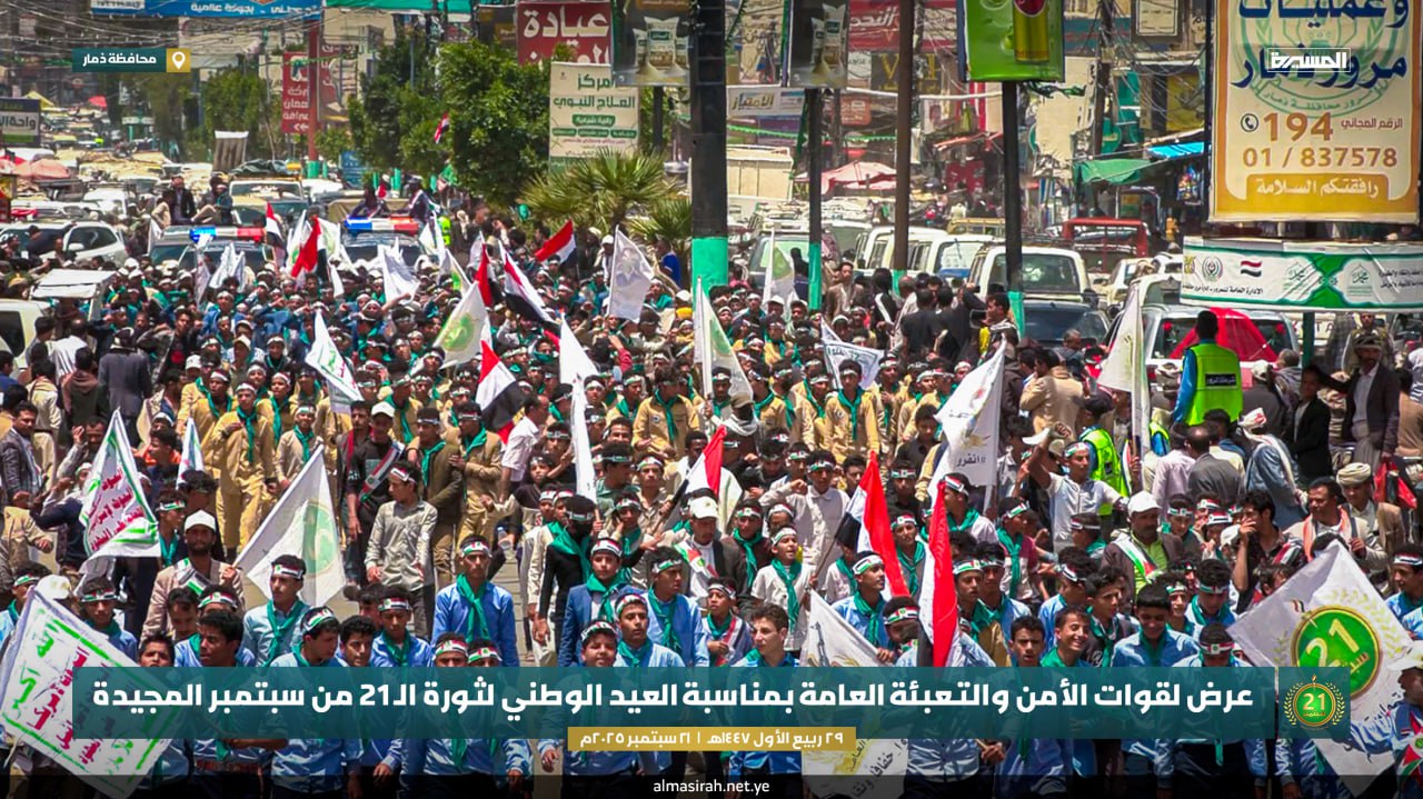 وانطلق العرض العسكري لوحدات رمزية من الأجهزة والوحدات الأمنية، ومنتسبو المكاتب التنفيذية، وفرق كشفية وطلابية، ودفعات من قوات التعبئة العامة من خريجي دورات "طوفان الأقصى"من الاستاد الرياضي إلى جولة شارع رداع مرورا بخط صنعاء تعز.