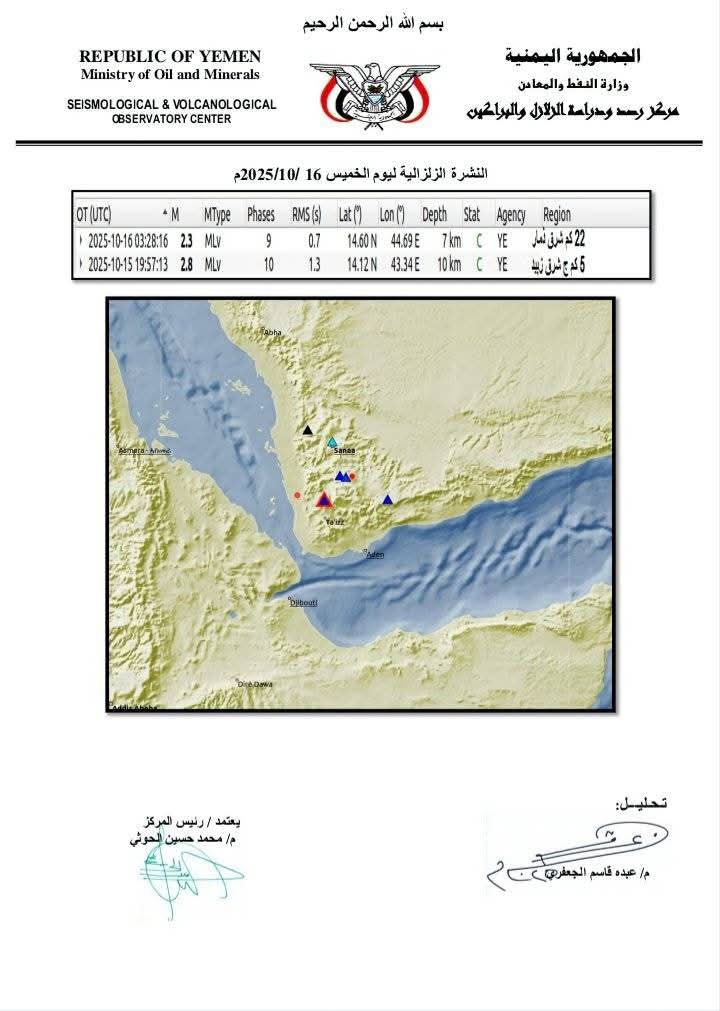 اضافة الى تسجيل هزة أرضية محلية بقوة 2.8 درجة الساعة 10.57 ليلا على بعد 5كم جنوب شرق زبيد محافظة الحديدة بحسب النشرة الزلزالية المرفقة.