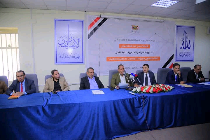 نظم قطاع التعليم العالي بوزارة التربية والتعليم والبحث العلمي بصنعاء اليوم لقاءً تشاوريًا مع رؤساء الجامعات الحكومية والأهلية لمناقشة المواضيع المتعلقة بآلية التنسيق والقبول وسير العملية التعليمية والأكاديمية والبحثية في الجامعات، والآشكاليات التي تواجهها والمعالجات المقترحة.