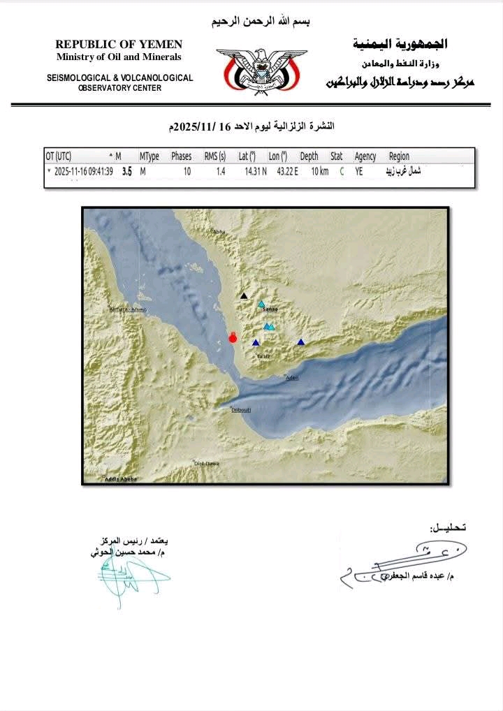 كما سُجلت هزة أرضية محلية بقوة: 3.5 درجة الساعة 12.41 اليوم شمال غرب زبيد محافظة الحديدة.