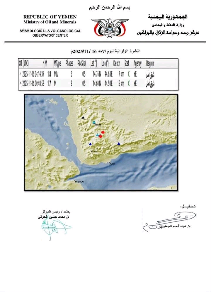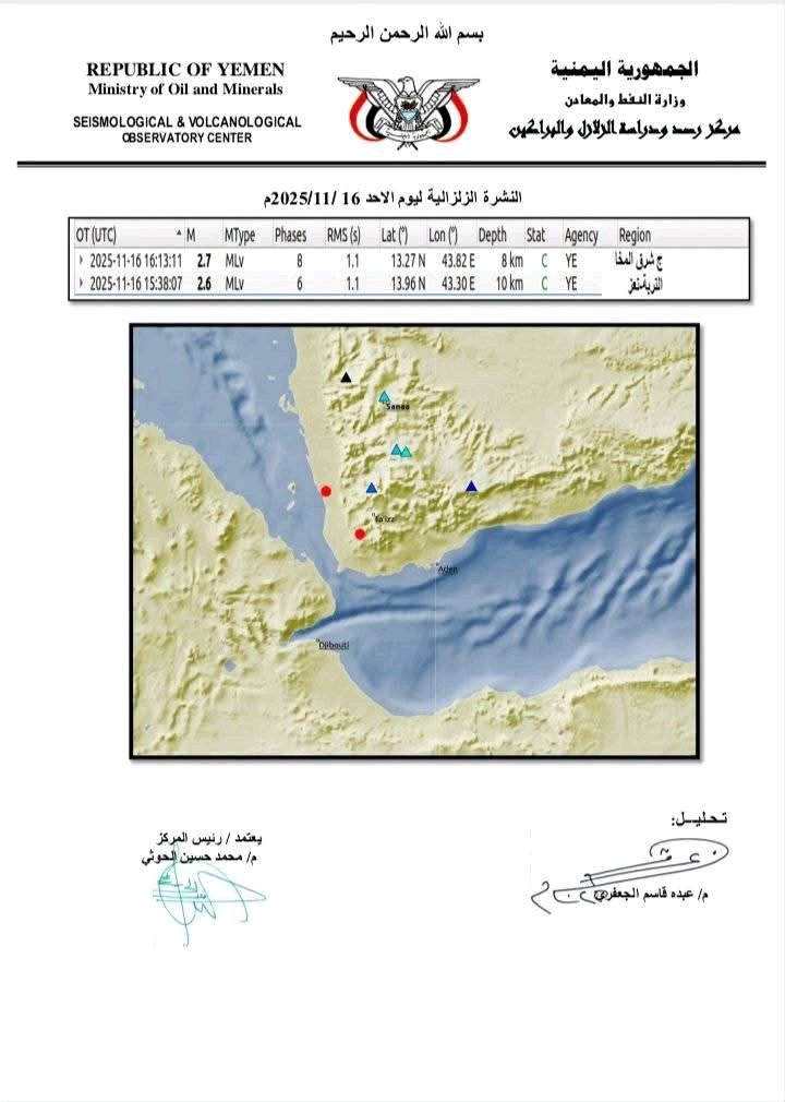 اضافة إلى تسجيل هزتين أرضتين خفيفتين بقوة "2.6" درجة و" 2.7 " درجة مساء اليوم الاحد في منطقتي التربة وجنوب شرق المخا بمحافظة تعز