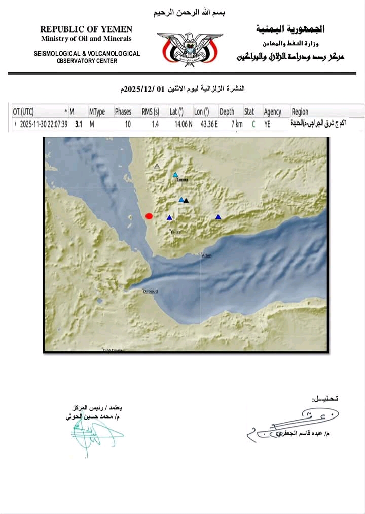 وأوضح رئيس مركز رصد ودارسة الزلازل والبراكين المهندس محمد حسين الحوثي أن المركز سجل اليوم هزة أرضية محلية خفيفه بقوة 3.1 درجة الساعة 1.07 ليلا على بعد 6 كم جنوب شرق الجراحي بمحافظة الحديدة