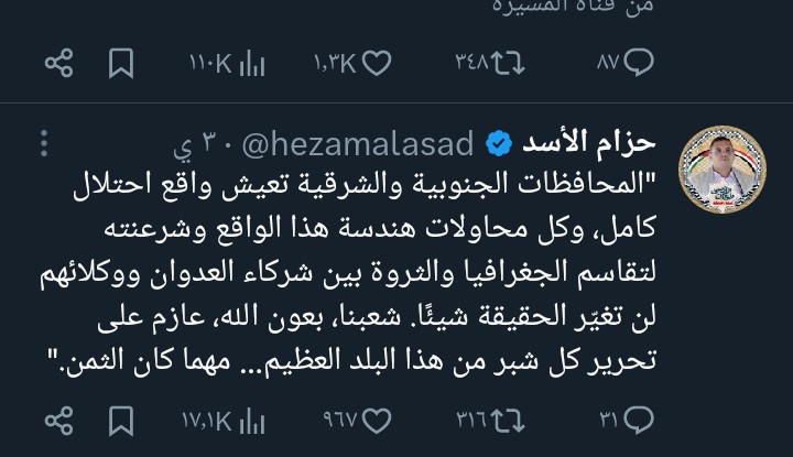 وقال الأسد في تدوينة على منصة ( أكس) "المحافظات الجنوبية والشرقية تعيش واقع احتلال كامل، وشعبنا عازم على تحرير كل شبر من هذا البلد العظيم… مهما كان الثمن."