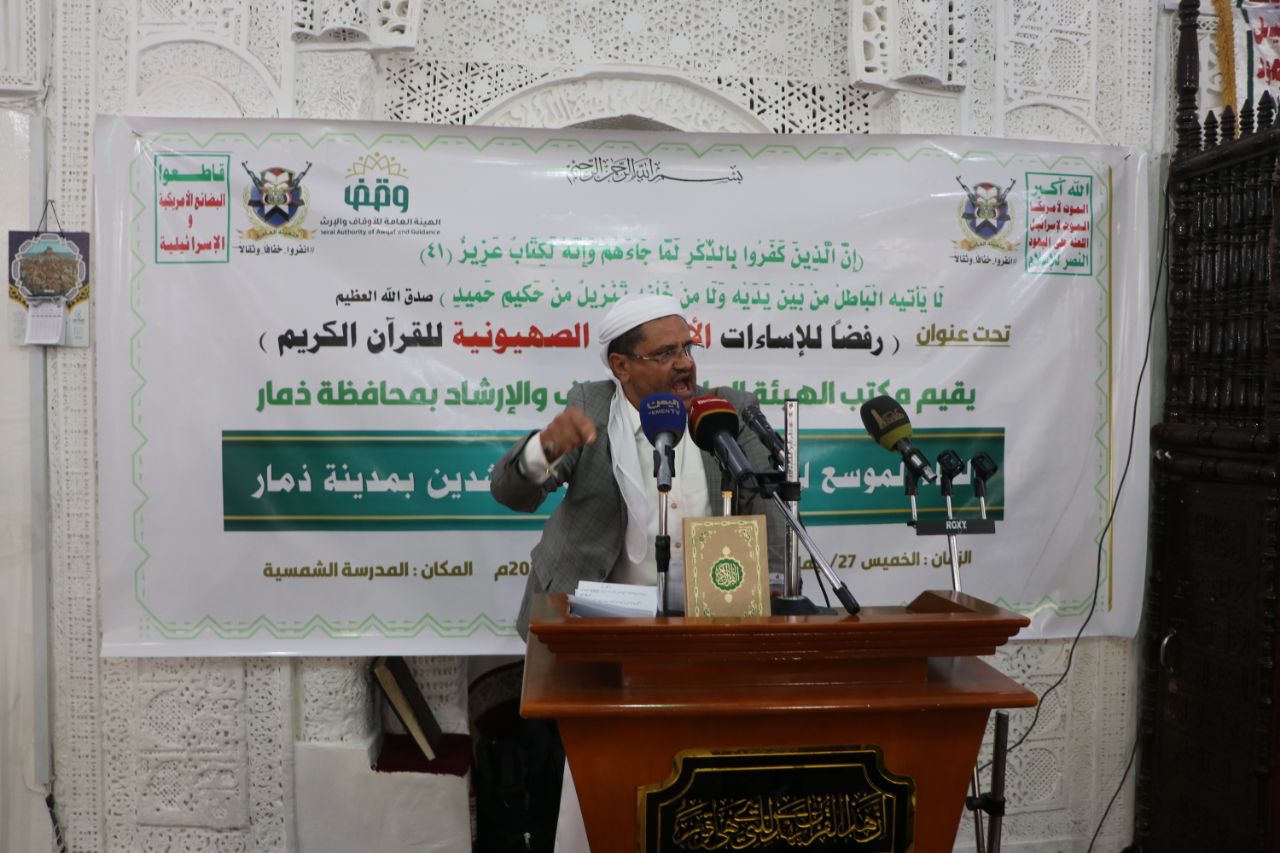نظمّ مكتب الهيئة العامة للإوقاف والارشاد بمحافظة ذمار ، اليوم، لقاءً موسعاً لعلماء وخطباء ومرشدي المحافظة، رفضا للاساءات الامريكية الاسرائيلية للقرآن الكريم والمقدسات الإسلامية.