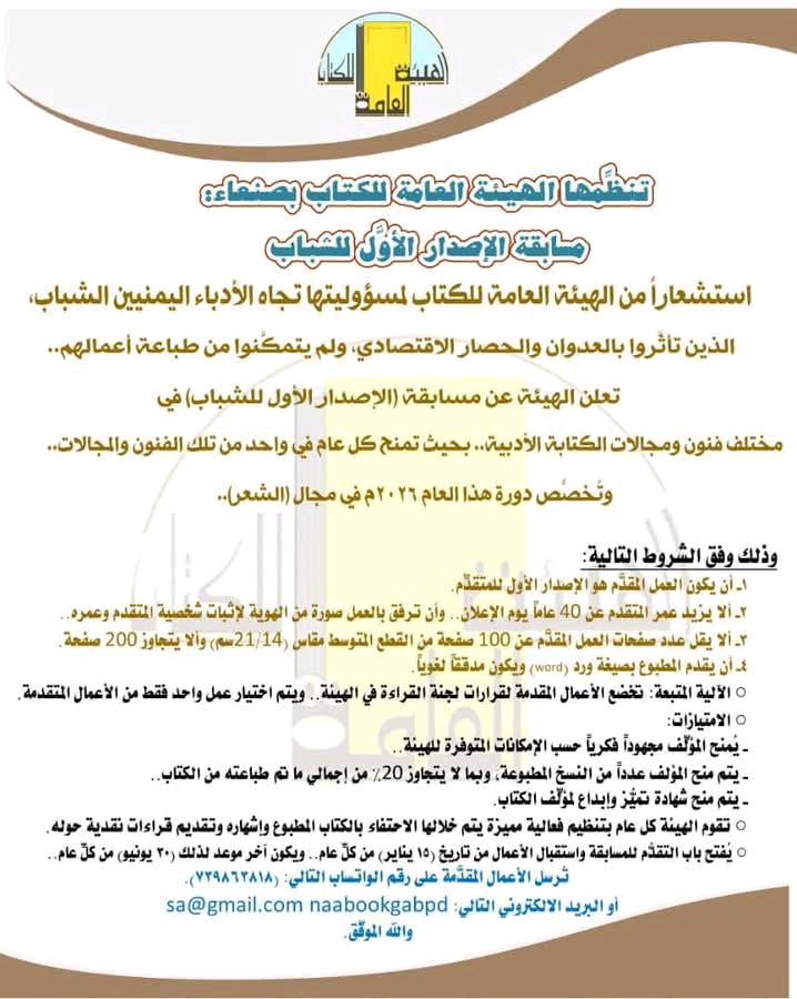 أعلنت الهيئة العامة للكتاب عن إطلاق مسابقة "الإصدار الأول للشباب " في مختلف فنون ومجالات الكتابة الأدبية، والتي خصصت هذا العام 2026م، في مجال الشعر.