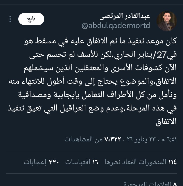 عبر رئيس اللجنة الوطنية لشؤون الأسرى ، عبدالقادر المرتضى، عن أسفه لتأخر تنفيذ ما تم الاتفاق عليه في مسقط بشأن ملف الأسرى والمعتقلين.