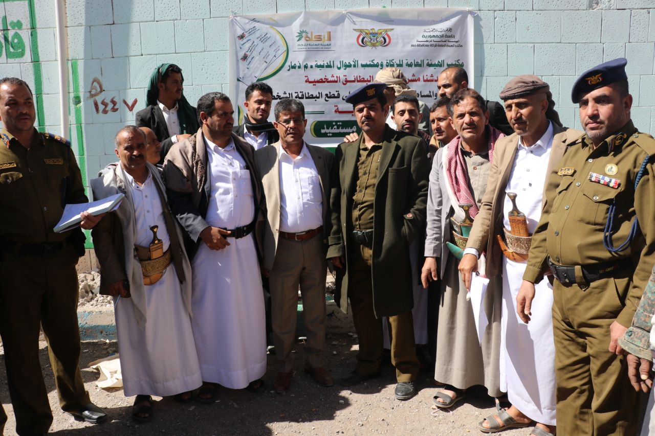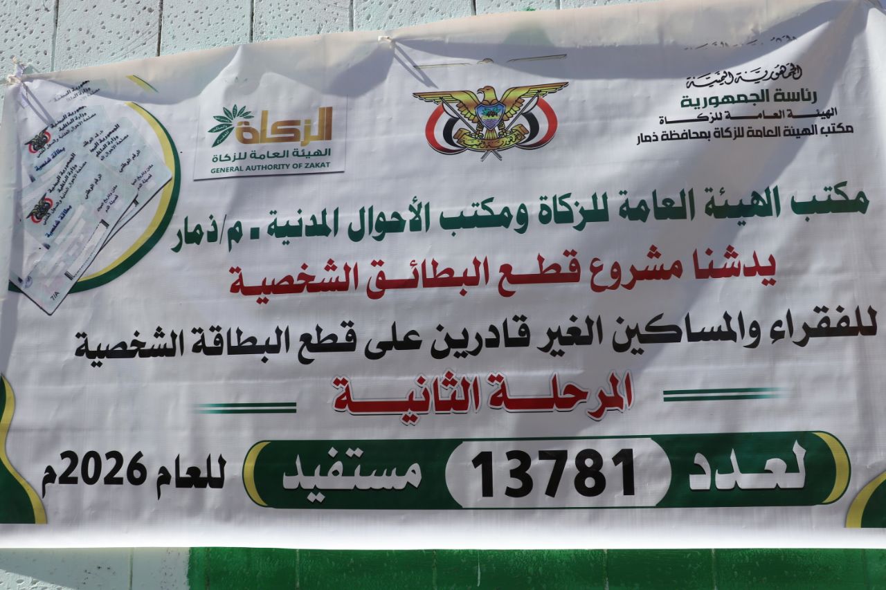 دشن مكتب الهيئة العامة للزكاة وفرع مصلحة الأموال المدنية بمحافظة ذمار، اليوم، مشروع إصدار البطاقة الشخصية الإلكترونية (المرحلة الثانية) لعدد 13 ألف و781 شخصاً من الفقراء والمساكين المستفيدين من هيئة الزكاة للعام 2026م.