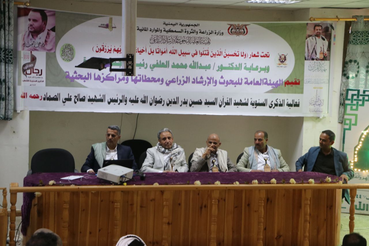 نظّمت الهيئة العامة للبحوث والإرشاد الزراعي، ومحطاتها ومراكزها البحثية اليوم، فعالية خطابية بالذكرى السنوية لشهيد القرآن السيد حسين بدر الدين الحوثي، والذكرى السنوية للشهيد الرئيس صالح الصماد.