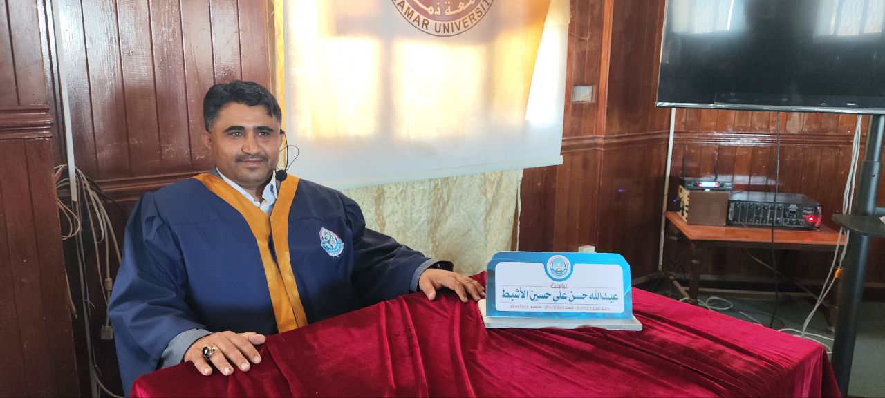 حصل الباحث عبدالله حسن علي الاشبط على درجة الماجستير بتقدير إمتياز في الإدارة العامة من كلية العلوم الإدارية بجامعة ذمار عن رسالته الموسومة بـ" القيادة الاستراتيجية ودورها في إدارة المخاطر " دراسة ميدانية على عينة من قيادات وزارة النفط والمعادن.