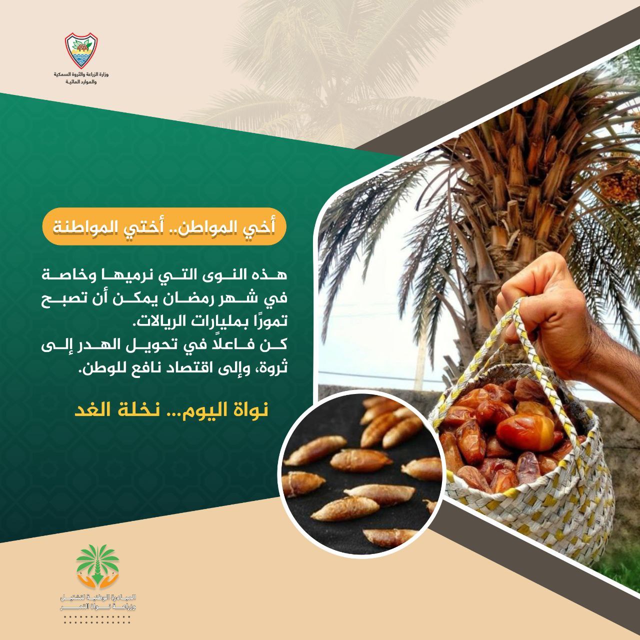 أطلقت وزارة الزراعة والثروة السمكية وعدد من الجهات ذات العلاقة المبادرة الوطنية لتشتيل وزراعة نواة التمر،تحت شعار "نواة اليوم نخلة الغد".