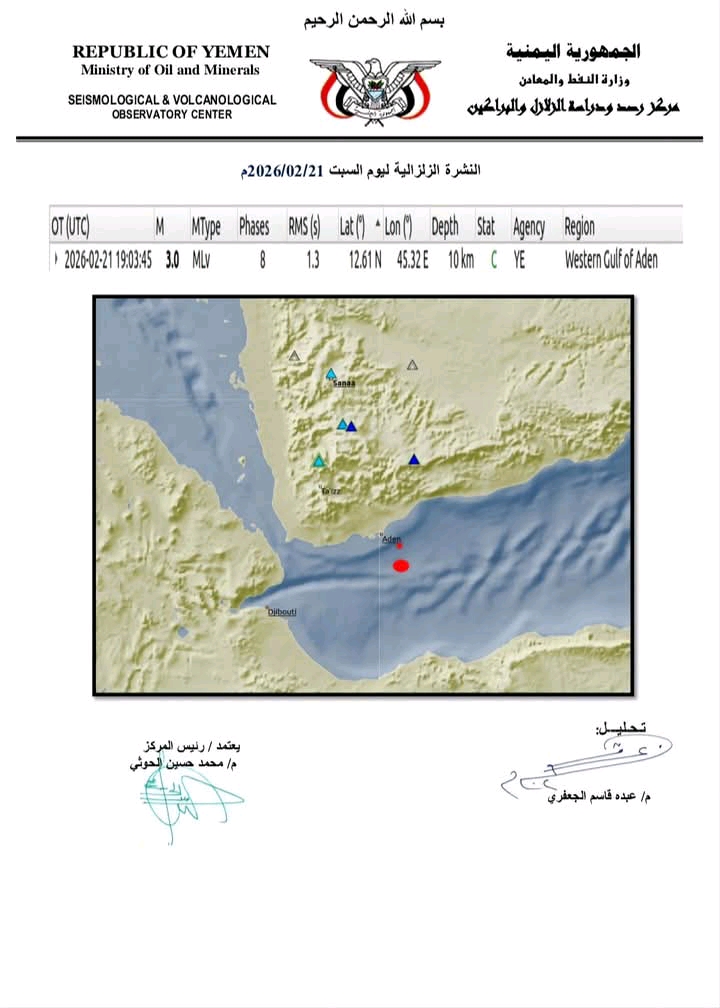 سجّلت محطات مركز رصد ودراسة الزلازل والبراكين اليوم، هزة أرضية غرب خليج عدن، بلغت قوتها 3.0 درجة على مقياس ريختر.