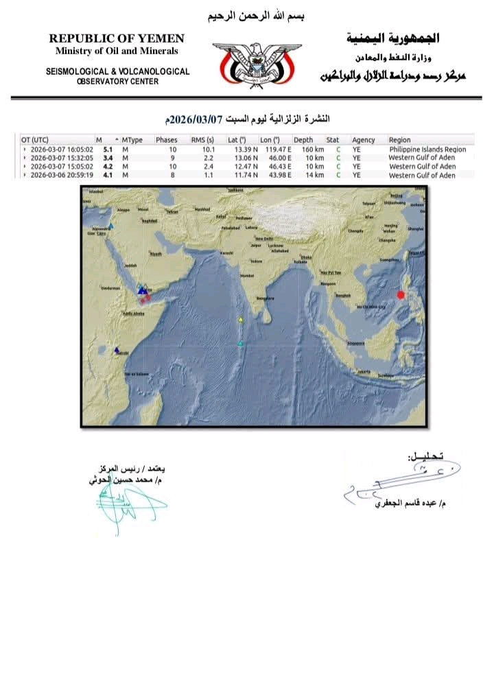 وأشار إلى أن المركز يسجّل العديد من الأنشطة الزلزالية في إطار خليج عدن، مؤكّدًا استمرار الرصد والمتابعة للنشاط الزلزالي على مدار الساعة.