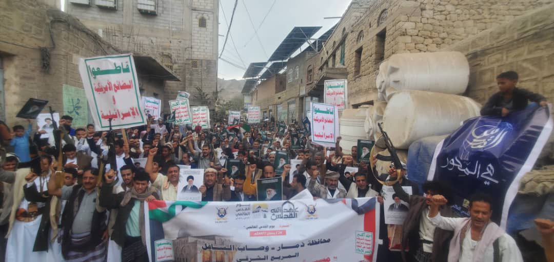 خرج أبناء محافظة ذمار اليوم بمسيرات جماهيرية حاشدة بمدينة ذمار و مديريات الحداء وضوران ومغرب عنس ووصاب السافل وجهران وجبل الشرق وعنس وعتمه ووصاب العالي والمنار وميفعة عنس ،إحياءً ليوم القدس العالمي.