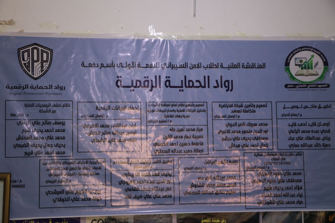 ناقش المعهد التقني التجاري التابع لمكتب التعليم الفني والمهني بمحافظة ذمار اليوم مشاريع التخرج لطلاب تقنية معلومات تخصص الأمن السيبراني الدفعة الأولى للعام الدراسي 1447هـ .