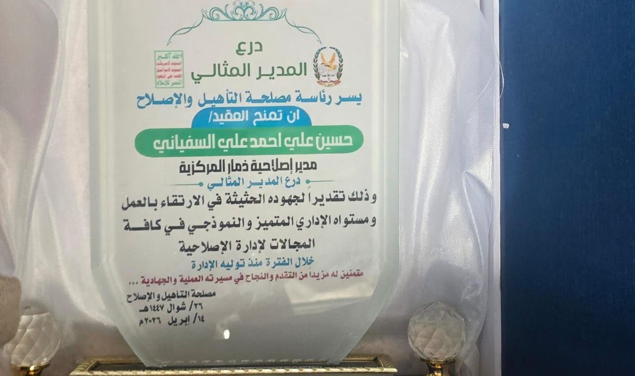 من جانبه، عبّر مدير الإصلاحية المركزية بمحافظة ذمار عن شكره وامتنانه لقيادة المصلحة على هذا التكريم، مثمناً اهتمامها ودعمها المستمر لجهود تحسين الأوضاع التأهيلية والصحية والتعليمية والإيوائية، وتوفير الخدمات اللازمة للنزلاء.