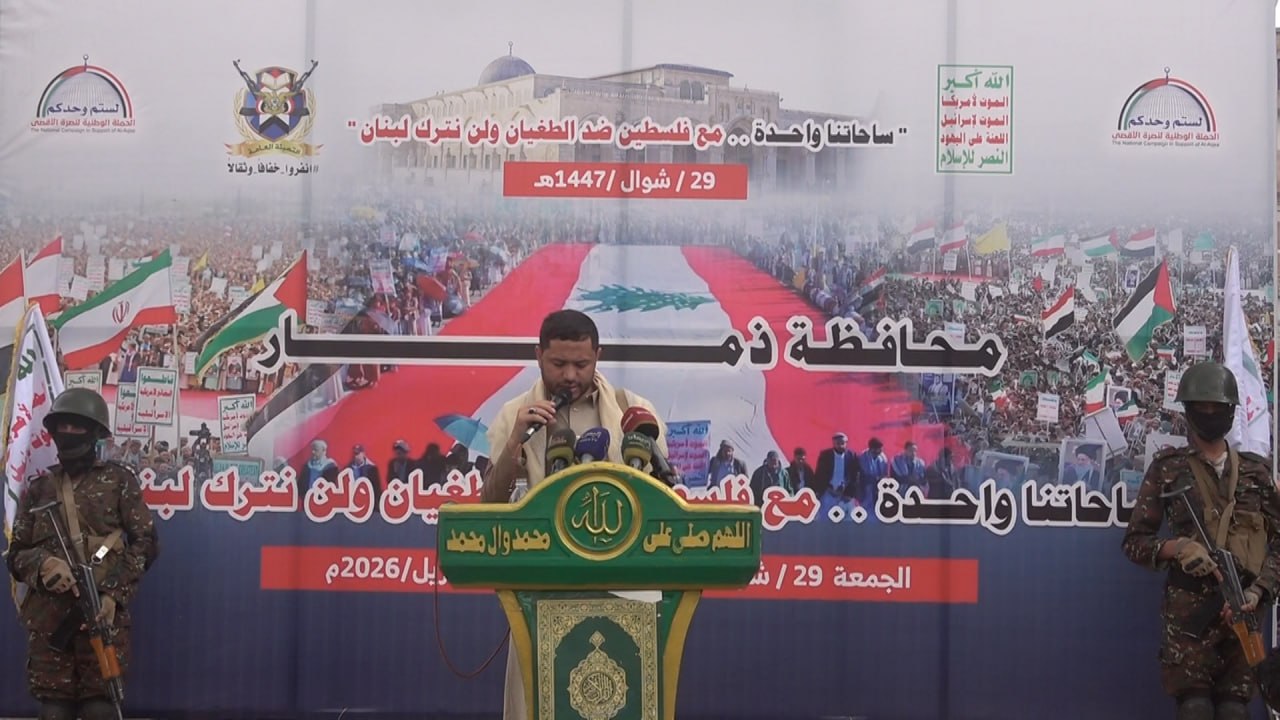 احتشد أبناء محافظة ذمار في 65 ساحة بمدينة ذمار، ومديريات عتمة، والمنار، ووصاب السافل، وجهران، ومغرب عنس، وضوران، والحداء، وعنس، ووصاب العالي، وجبل الشرق، وميفعة عنس، بمسيرات "ساحاتنا واحدة.. مع فلسطين ضد الطغيان ولن نترك لبنان".