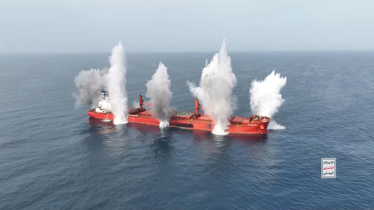 بث الإعلام الحربي التابع للقوات المسلحة اليمنية مساء اليوم مشاهد لاستهداف واغراق السفينة ...