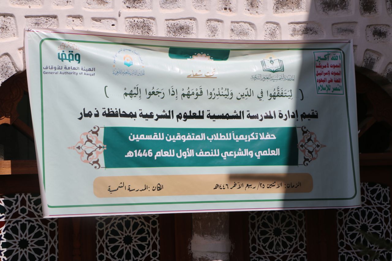 نظمت المدرسة الشمسية للعلوم الشرعية بمدينة ذمار اليوم، حفلاً تكريمياً للطلاب المتفوقين للقسمين العلمي والشرعي تحت شعار " لِّيَتَفَقَّهُواْ فِي الدِّينِ وَلِيُنذِرُواْ قَوْمَهُمْ إِذَا رَجَعُواْ إِلَيْهِمْ "، للنصف الأول للعام 1446هـ .