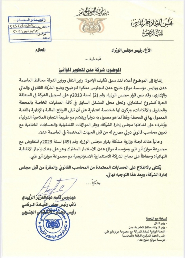 حالياً تحاول الامارات الاستحواذ على موانئ عدن المنافسة لموانئ دبي وميناء جبل علي، عبر ’’المجلس الانتقالي ’’ حيث كشفت وسائل إعلام محلية عن وثيقة مسربة موجّهه من رئيس المجلس نائب ما يسمى بالمجلس الرئاسي عيدروس الزبيدي , الى رئيس حكومة المنفى طالبة فيها بتسهيل تسليم ميناء عدن للأمارات.