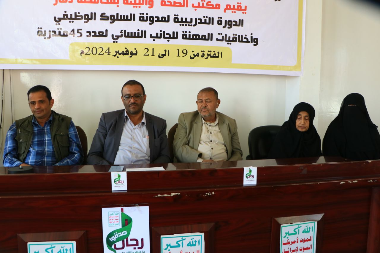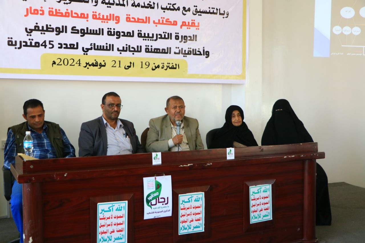 بدأت في مكتب الصحة والبيئة بمحافظة ذمار اليوم دورة تدريبية للكادر النسائي بالمكتب حول " مدونة السلوك الوظيفي وأخلاقيات العمل " .