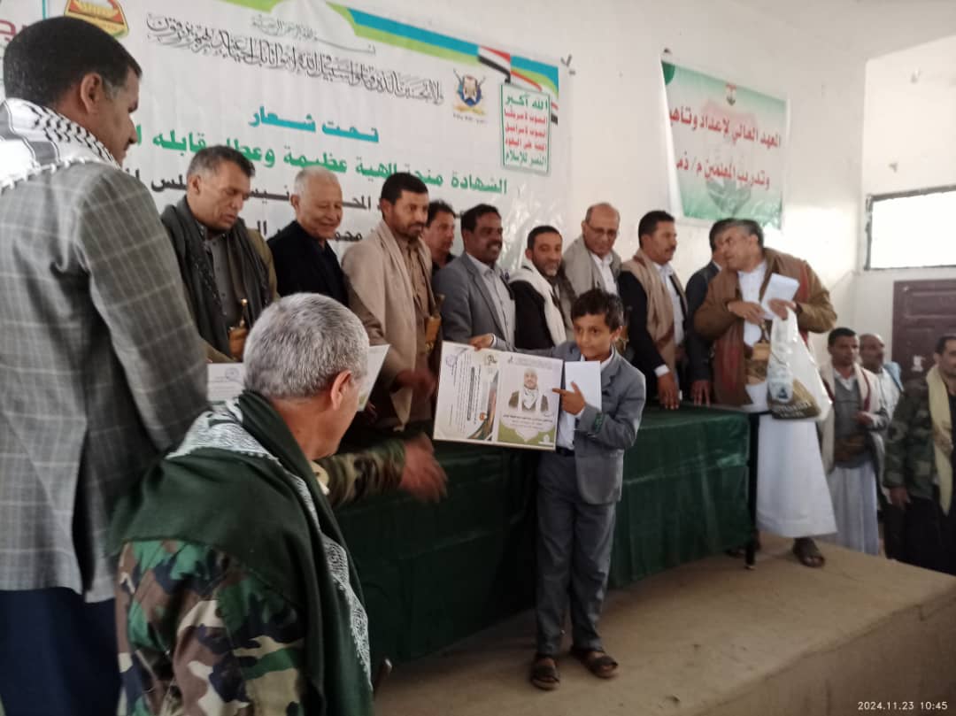 وفي ختام الفعالية كرم مسؤول التعبئة العامة الضوراني ووكيل المحافظة عبد الرزاق والتربية الهادي 41 أسرة شهيد من منتسبي مكتب التربية بالمحافظة بشهادات التقدير ومبالغ مالية .