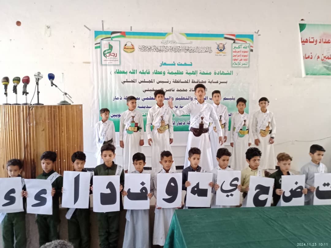 نظم مكتب التربية والتعليم والبحث العلمي بمحافظة ذمار اليوم، فعالية خطابية وتكريمية لأسر الشهداء من منتسبي القطاع التربوي تزامنا مع الذكرى السنوية للشهيد للعام 1446هـ، بحضور محافظ ذمار محمد ناصر البخيتي ومسؤول التعبئة العامة أحمد حسين الضوراني ووكيل محافظة محمد عبد الرزاق.