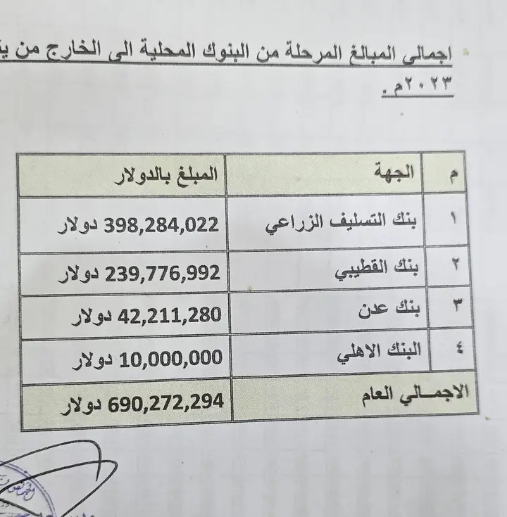 ففي العام 2023م ، بحسب الوثائق تم إخراج مبلغ 690 مليون دولار أمريكي، عبر مطار عدن الدولي فقط ، ناهيك عن بقية المنافذ .