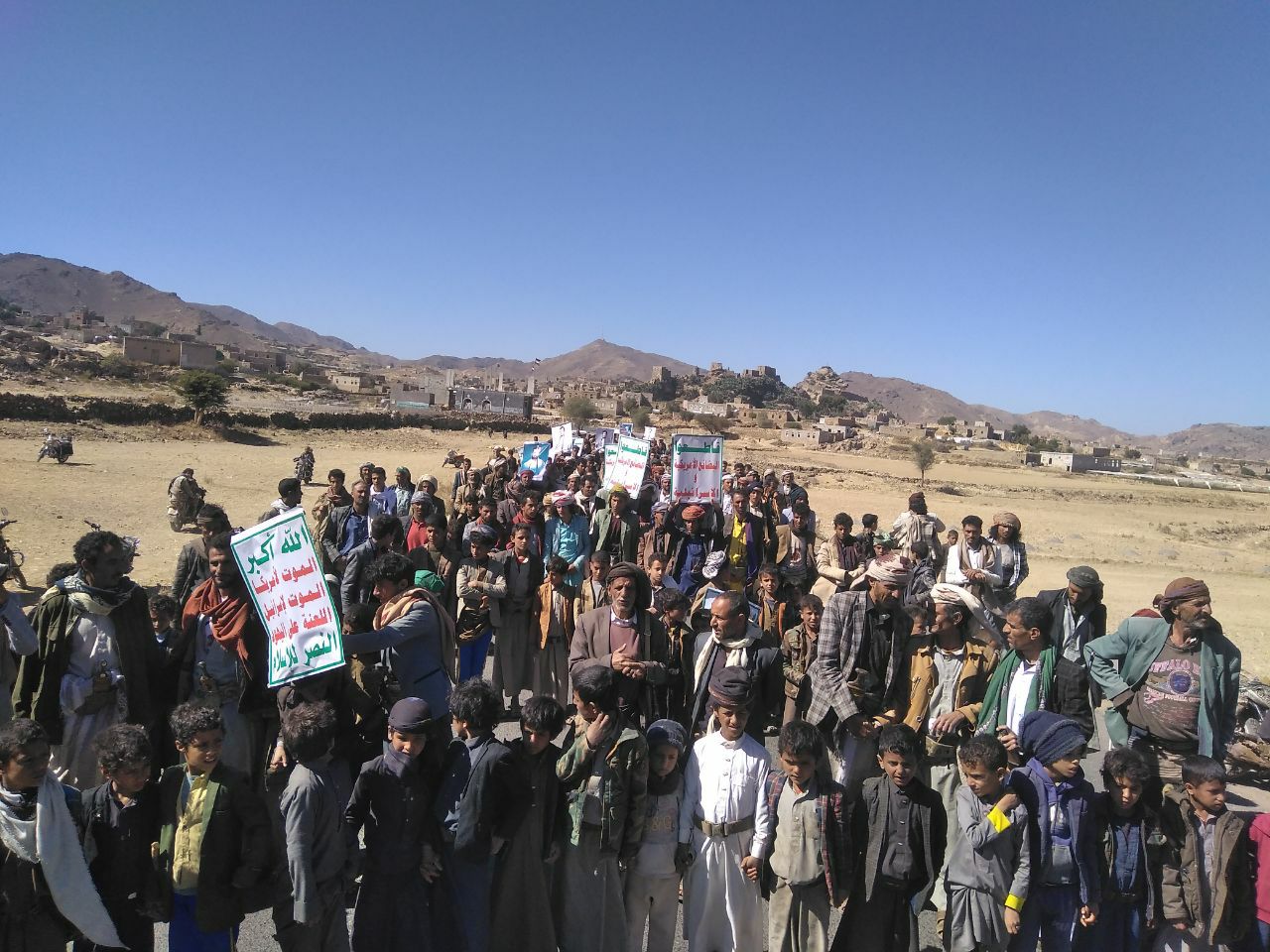 ورفع المشاركون في المسيرات "بمنطقة حدقة لأبناء الدائرة 205 ومنطقة عاثين لأبناء خمس الجبال ومنطقة الوعري لأبناء بني السهاقي وبني الشيعي والمرون وبيت العنسي صباحاً، ومدينة ضوران لأبناء الدائرة 204 عصراً "، بحضور قيادات تنفيذية ومحلية ، وتعبوية ، وشخصيات إجتماعية ، الأعلام اليمنية والفلسطينية ورايات الحرية ورايات المقاومة، وصورًا للقادة الشهداء ،