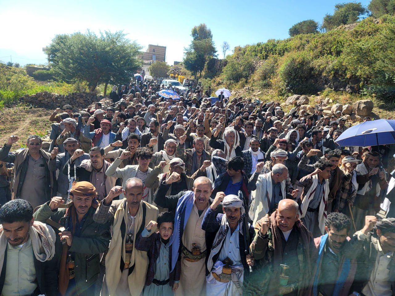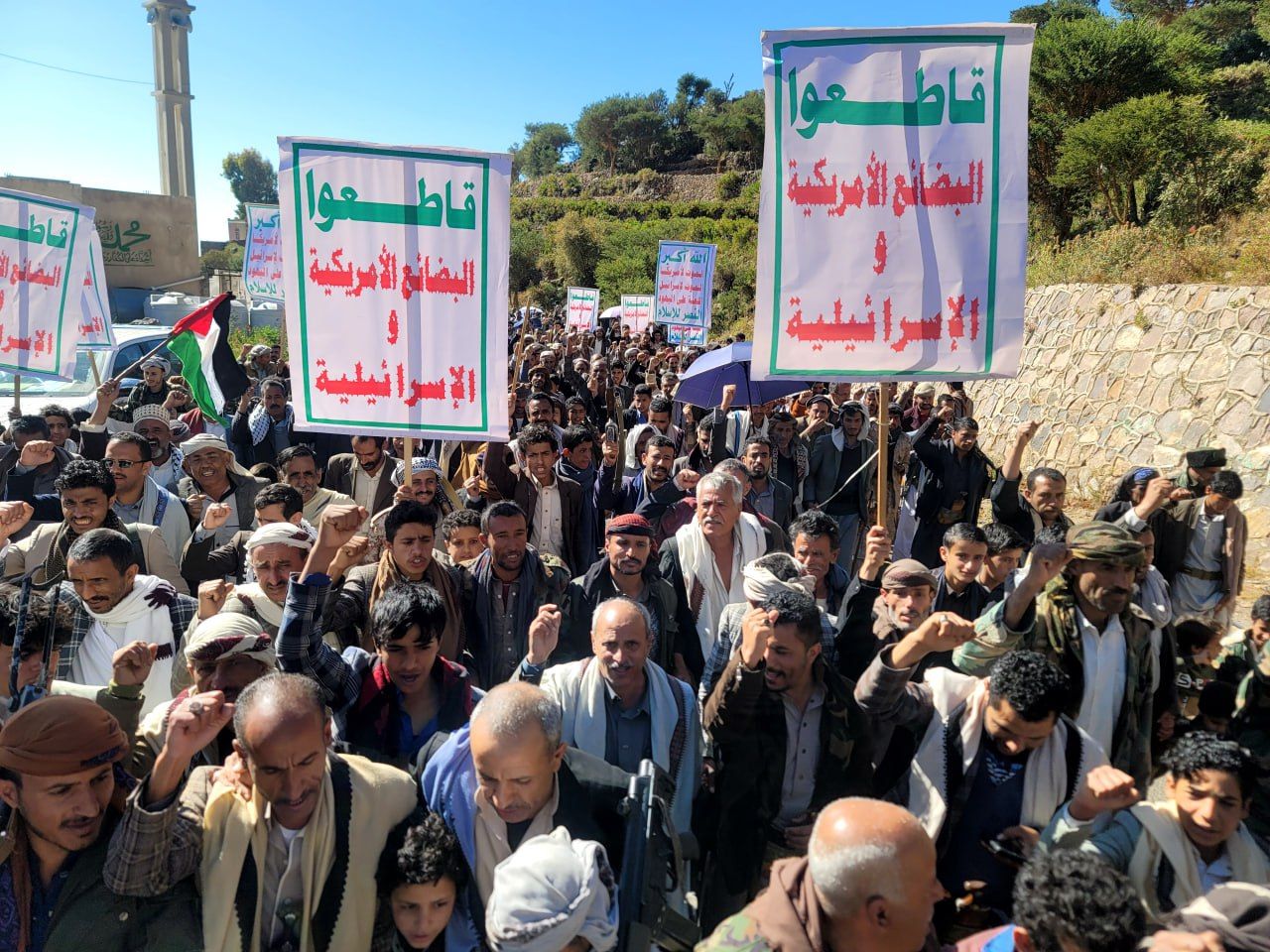 وفي ذات السياق نظم أبناء مديرية مغرب عنس مسيرة جماهيرية ووقفات في بني جبر وشجن والشعبية تضامنا مع الشعب الفلسطيني وإسناد معركة الفتح الموعود والجهاد المقدس تحت شعار "ثابتون مع غزة العزة.. بلاسقف ولاخطوط حمراء "
