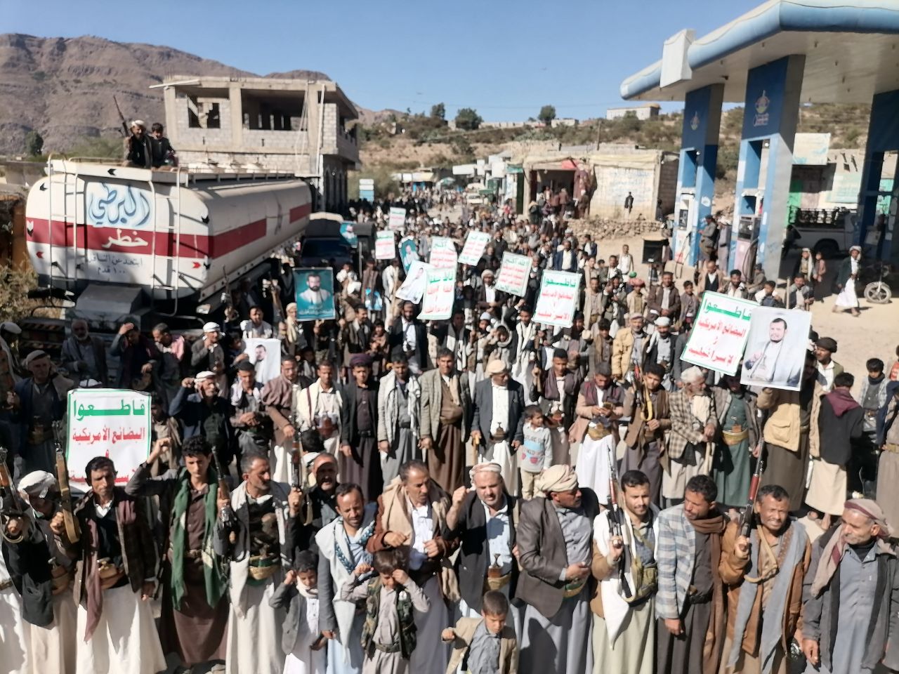 ونددوا المشاركون في المسيرة التي تقدمها مدير المديرية فضل الحربي والقيادات المحلية والتنفيذية والتعبوية باستمرار التخاذل العربي والإسلامي المقيت، والعجز والصمت الأممي المريب، وما تزال جرائم العدو الصهيوني، الأمريكي، البريطاني، مستمرة في غزة وتتوسع وتتمدد في الضفة الغربية والقدس وسوريا ولبنان، سعياً لتحقيق مشروعه الصهيوني المسمى بـ" إسرائيل الكبرى" الذي يهدد كل المنطقة.