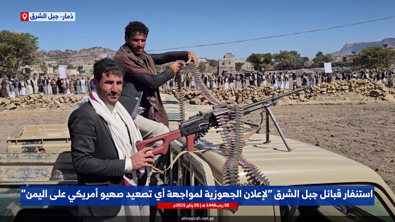 وفي ذات السياق احتشد أبناء وقبائل مديرية جبل الشرق اليوم، في وقفة قبلية مُسلحة حاشدة، إعلاناً للجهوزية الكاملة لمواجهة أي تصعيد صهيو أمريكي على اليمن، ونُصرةً للشعب الفلسطيني.