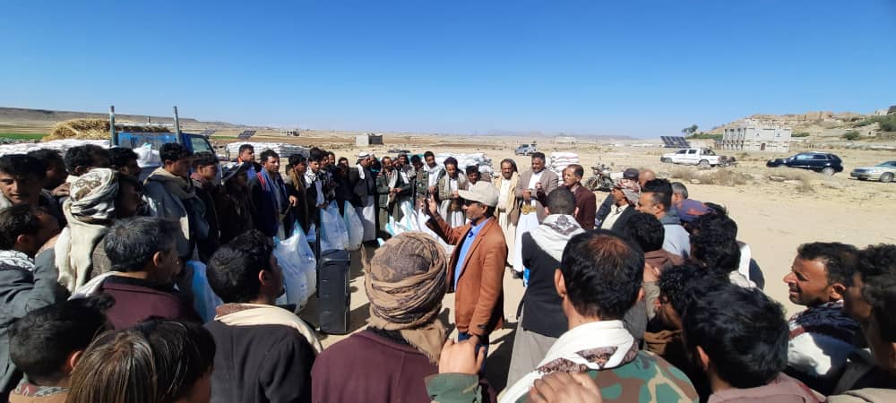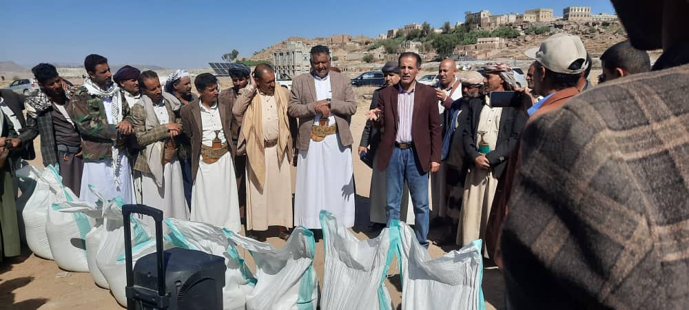 دشنت جمعية عنس الزراعية لمنتجي الحبوب بمحافظة ذمار، اليوم، توزيع بذور الحبوب والبقوليات لمزارعي مديرية مدينة ذمار.