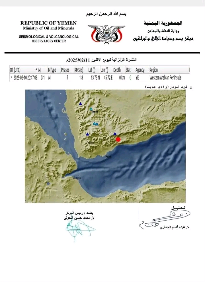 وأوضح رئيس المركز المهندس محمد حسين الحوثي ان هزة أرضية بقوة 3.1 درجة على مقياس ريختر تم رصدها بوادي حديد أبين وشعر بها الناس في البيضاء ويافع.