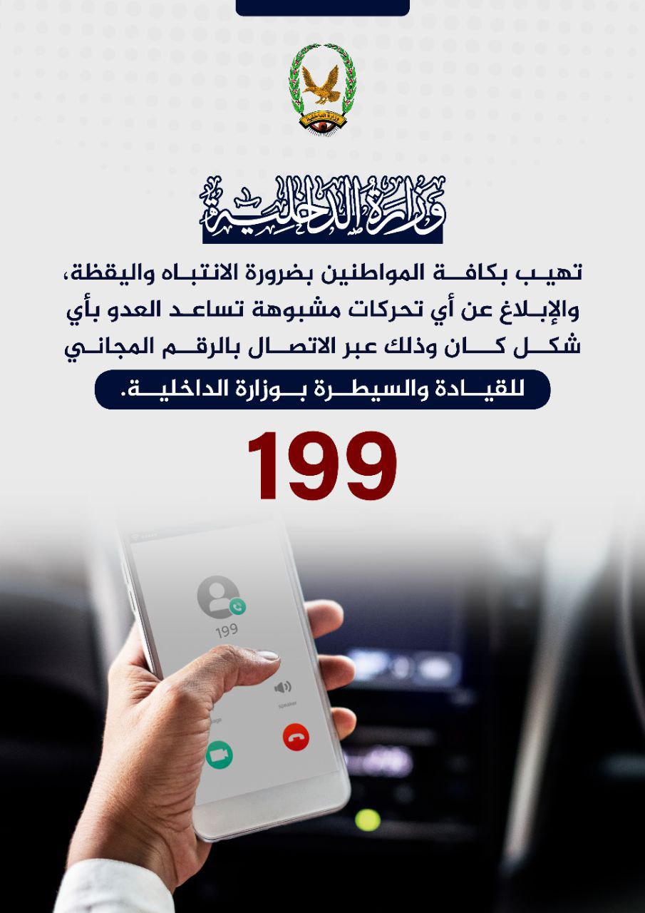 أهابت وزارة الداخلية في بيان بضرورة الانتباه واليقظة، والإبلاغ عن أي تحركات مشبوهة تساعد العدو بأي شكل كان وذلك عبر الاتصال بالرقم المجاني للقيادة والسيطرة بوزارة الداخلية