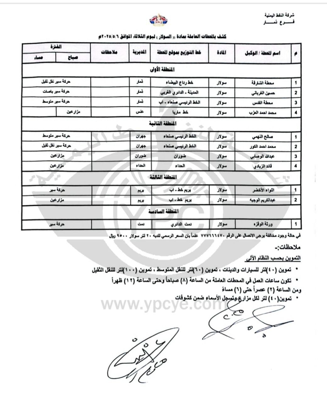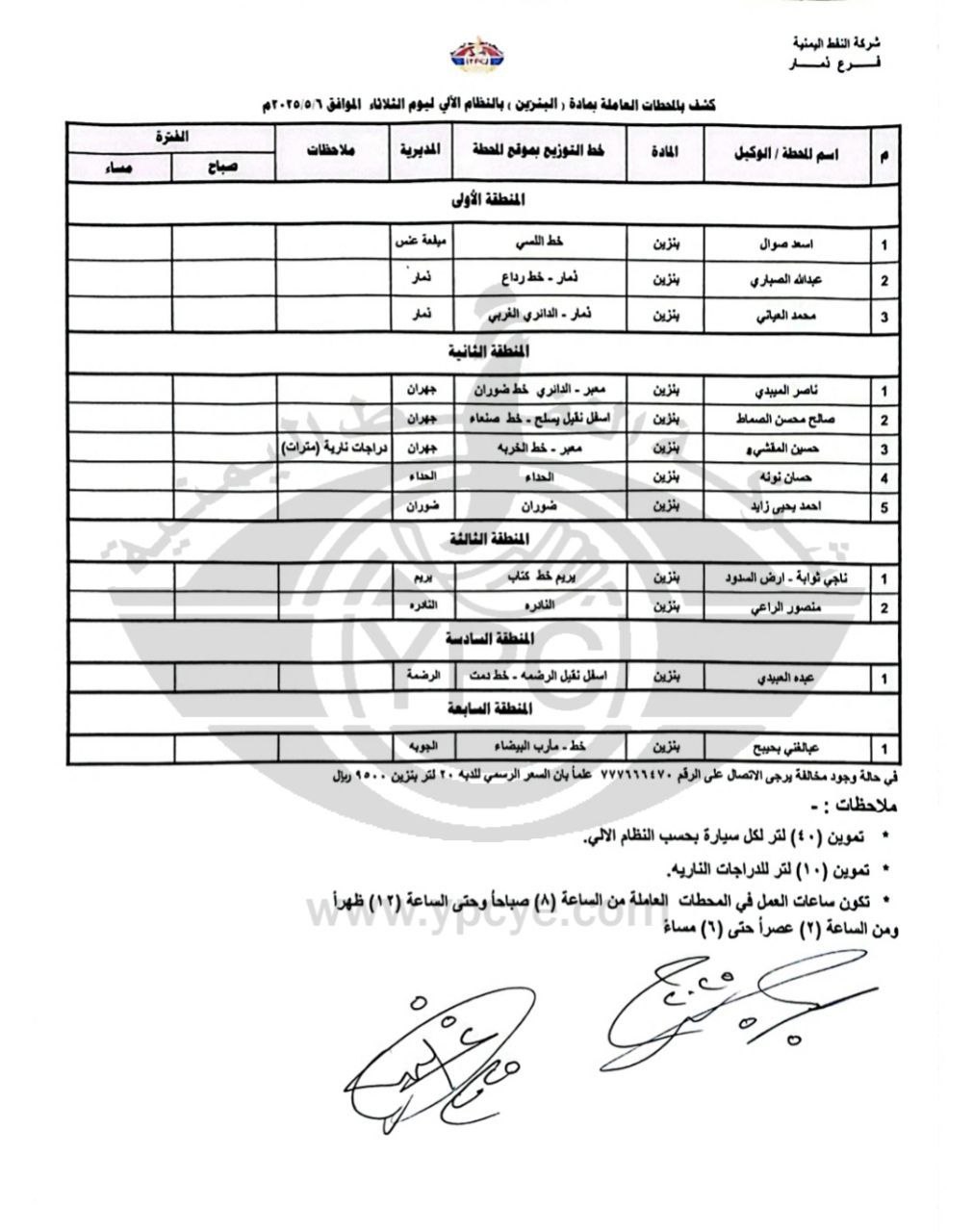 نشرت شركة النفط اليمنية مساء اليوم كشوفات بأسماء المحطات العاملة في محافظة ذمار وبعض من مناطق محافظة إب و مأرب لمادتي البنزين والديزل العاملة ليوم غدا الثلاثاء