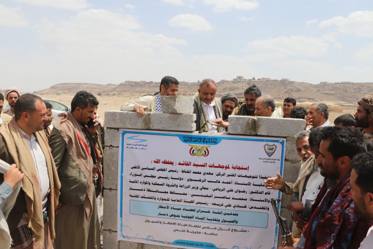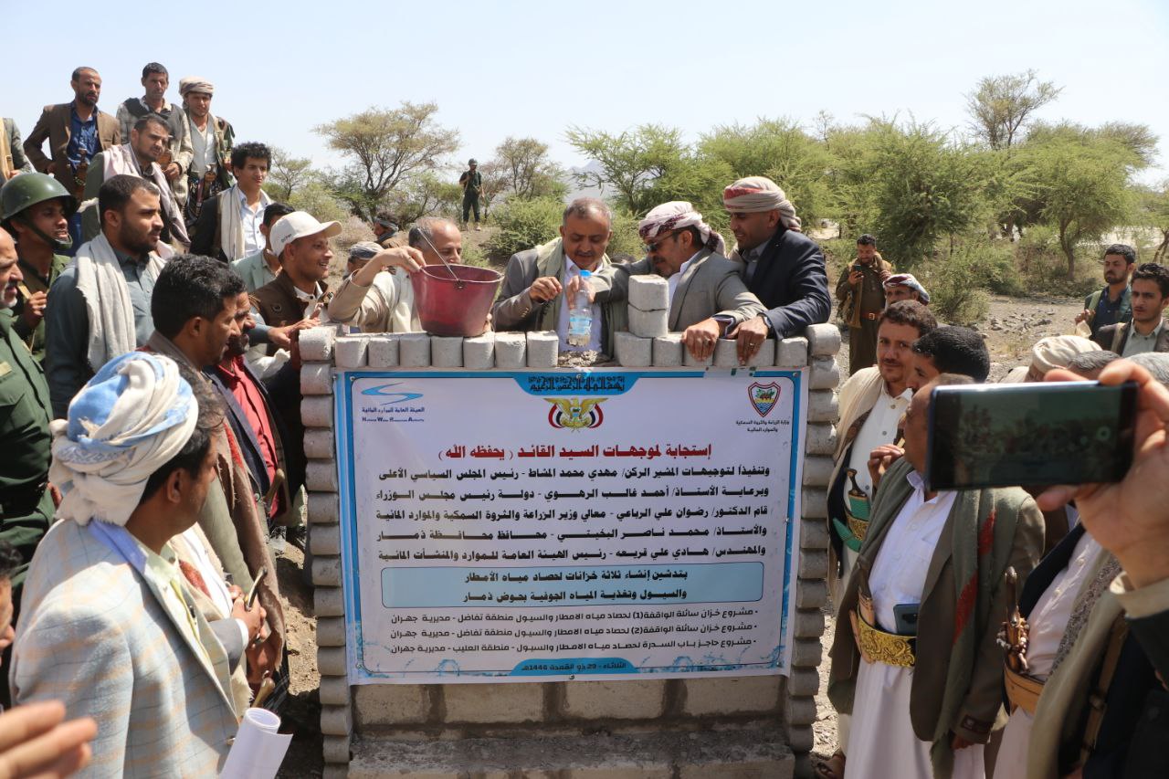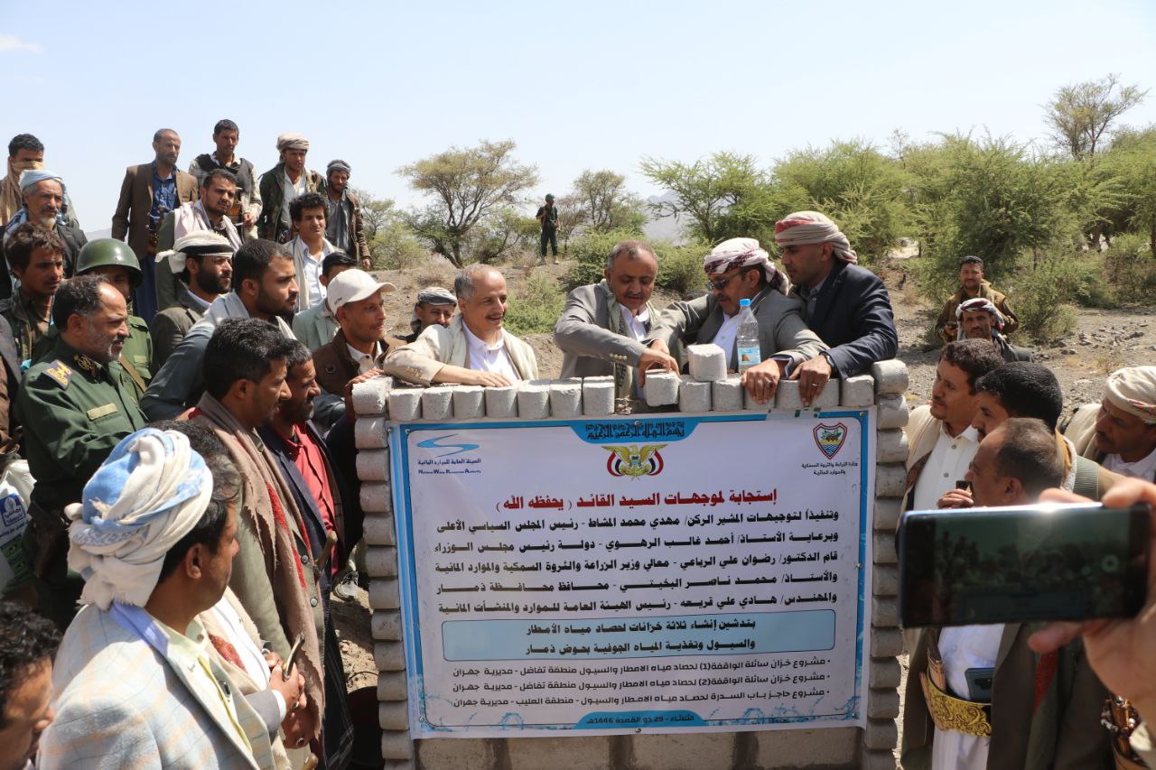 وضع وزير الزراعة والثروة السمكية والموارد والمنشآت المائية الدكتور رضوان الرباعي ومحافظ ذمار محمد ناصر البخيتي ورئيس الهيئة العامة للموارد والمنشآت المائية المهندس هادي قريعه اليوم حجر الأساس لمشروع إنشاء أربعة خزانات لحصاد المياه في مديرتي جهران وعنس.