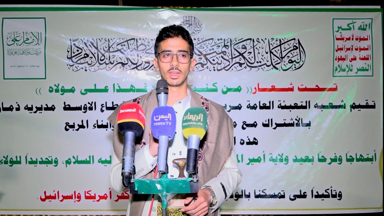 نظمت شعبة التعبئة العامة وأبناء مربع المحل الأعلى بالقطاع الاوسط بمديرية مدينة ذمار أمسية ثقافية بمناسبة ذكرى الولاية تحت شعار " من كنت مولاه فهذا علي مولاه " .