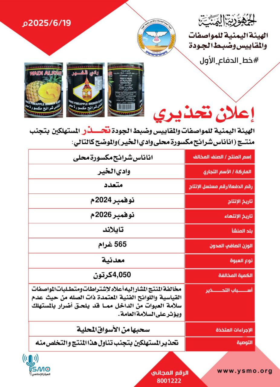 أصدرت الهيئة اليمنية للمواصفات والمقاييس وضبط الجودة في صنعاء تحذيراً للمستهلكين وأصحاب محلات البيع بعدم شراء أو بيع منتج أناناس شرائح مكسورة محلى ماركة وادي الخير- تايلندي الصنع.