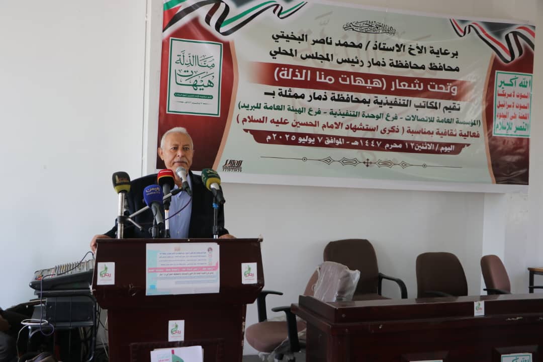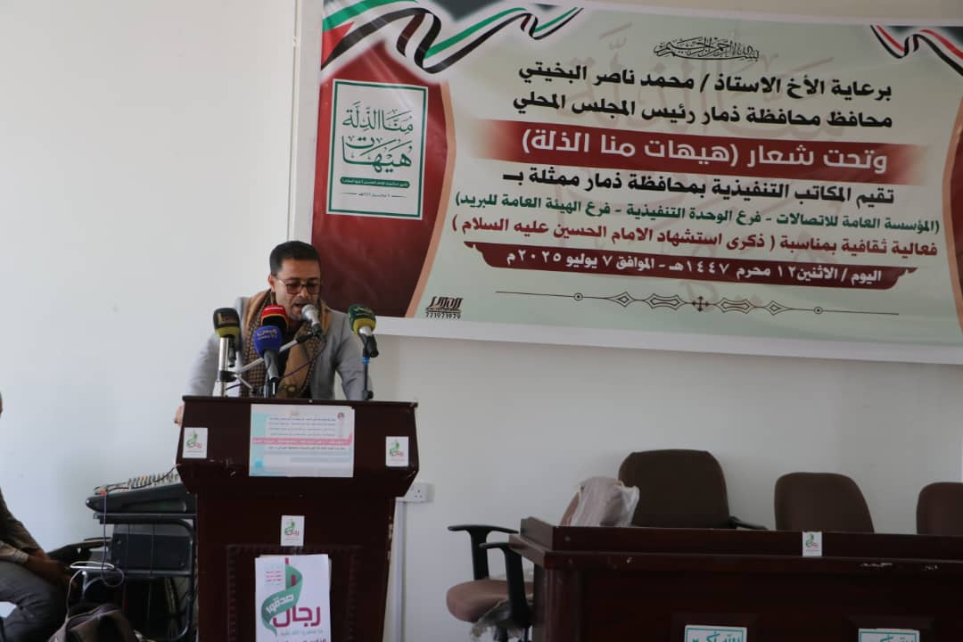 نظمت فروع المؤسسة العامة للاتصالات وهيئة البريد والوحدة التنفيذية للانشاءات بمحافظة ذمار اليوم فعالية ثقافية بمناسبة ذكرى استشهاد الإمام الحسين علية السلام تحت شعار " هيهات منا الذلة "
