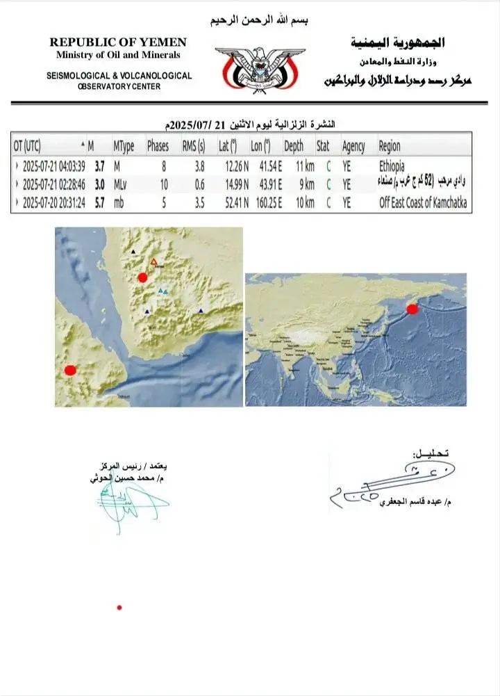 كما سجّل المركز عددًا من الزلازل البعيدة والهزات الأرضية الإقليمية، منها زلزال بقوة (5.7) درجة في شبه جزيرة كامتشاتكا الروسية، وهزة أرضية في إثيوبيا بقوة (3.7) درجة على مقياس ريختر.
