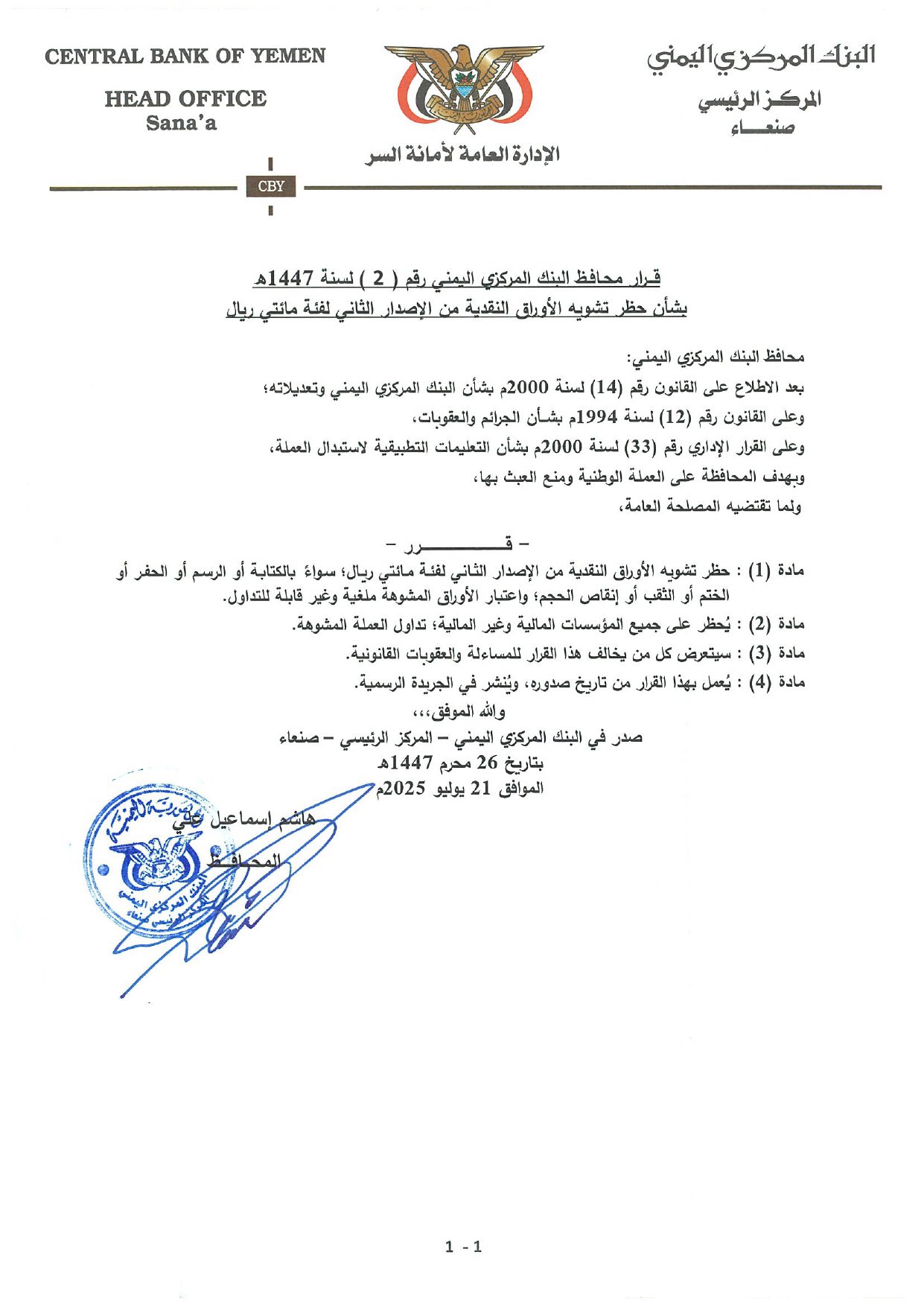 صدر قرار محافظ البنك المركزي اليمني رقم (2) لسنة 1447هـ، بشأن حظر تشويه الأوراق النقدية من الإصدار الثاني لفئة مائتي ريال.