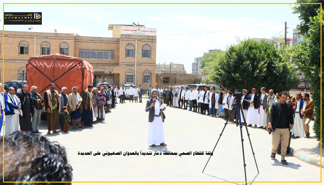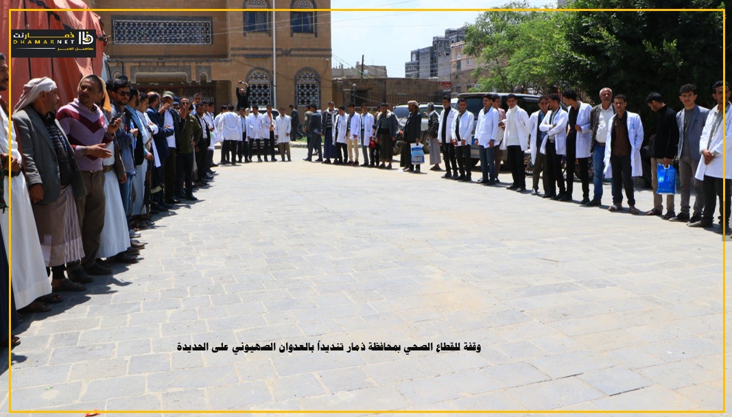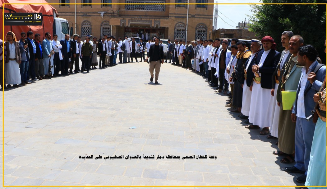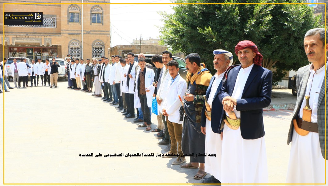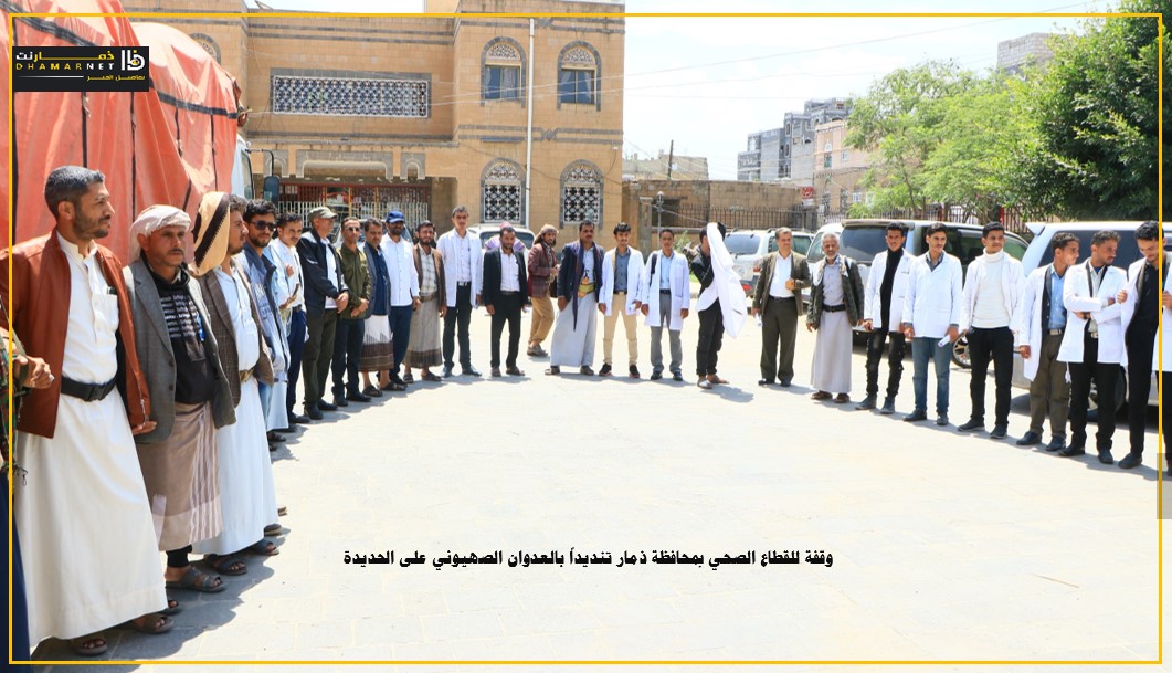 نظم مكتب الصحة العامة والسكان والمعهد العالي للعلوم الصحية بمحافظة ذمار اليوم , وقفة للتنديد بالعدوان الاسرائيلي على الأعيان المدنية في محافظة الحديدة وتضامنا مع الشعب الفلسطيني وتأييدا لقرارات قائد الثورة السيد عبدالملك بدر الدين الحوثي.