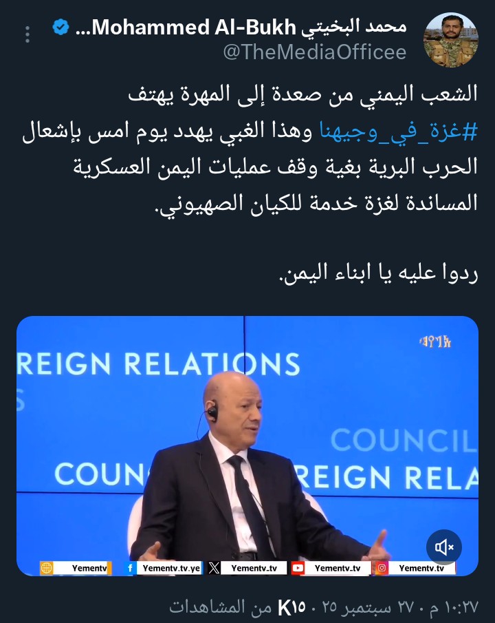 وأضاف البخيتي: “أليس هذا اعترافًا رسميًا وعمليًا بأنهم يشكلون الخط الدفاعي الأول عن الكيان الصهيوني؟”، في إشارة إلى تصريحات سابقة من قبل العرادة والزبيدي وطارق عفاش وغيرهم من قادة وأدوات التحالف في اليمن وخارج اليمن.