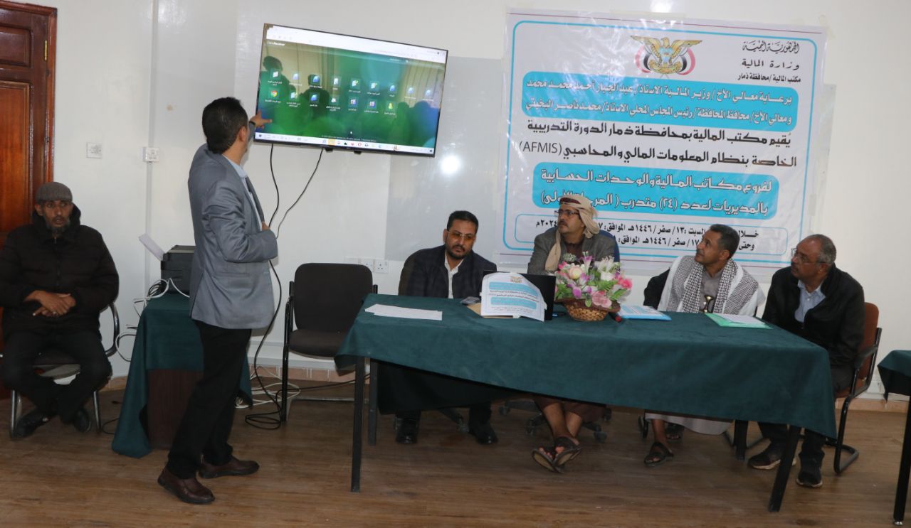بدأت اليوم بمحافظة ذمار فعاليات الدورة التدريبية الخاصة بمدراء فروع المالية والوحدات الحسابية بمديريات محافظة ذمار حول نظام المعلومات المالي والمحاسبي "أفميس" المرحلة الأولي.