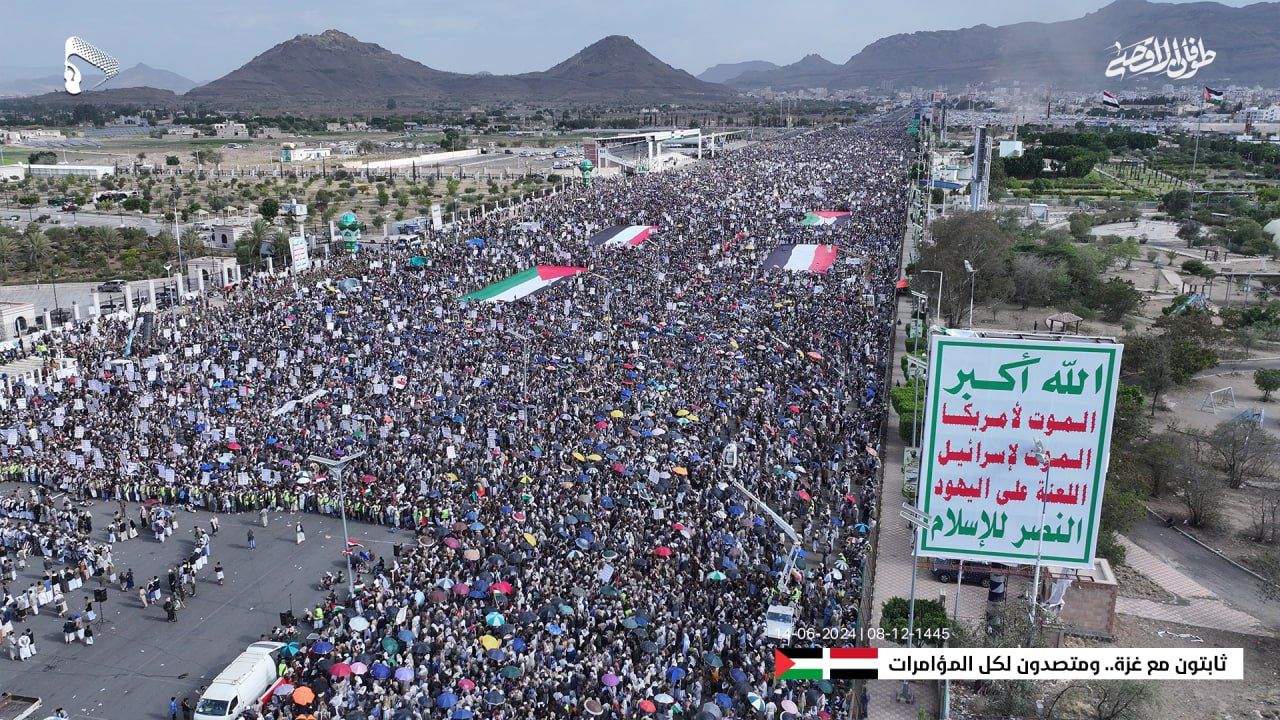 وأكدت الحشود،تأييدها وتفويضها لقائد الثورة، ومباركتها للعمليات العسكرية التي تنفذها القوات المسلحة ضد العدوان الأمريكي والصهيوني والبريطاني، والمطالبة بالمزيد من التصعيد والضربات البالستية والجوية المؤلمة للعدو.