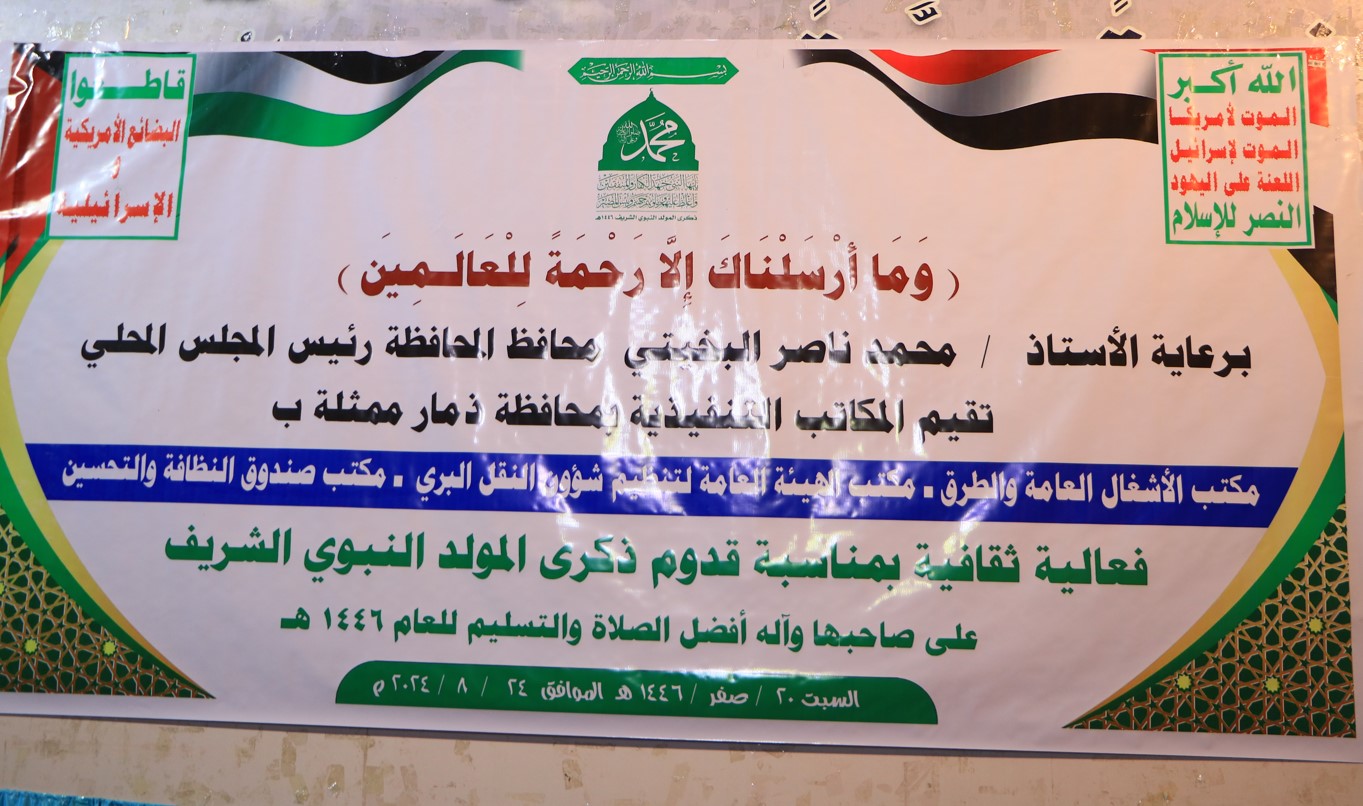 نظمت مكاتب النقل والاشغال العامة والطرق وصندوق النظافة والتحسين بمحافظة ذمار اليوم , فعالية ثقافية بمناسبة قدوم ذكرى المولد النبوي الشريف للعام 1446هـ .